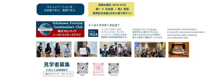 2026年から、「開港記念会館」へお引越しします✨ 歴史ある建物の会議室で、いつもとちょっと違う雰囲気の中、 新たな気持ちでスピーチを楽しみましょう!2026年例会:1月6日(水)19: […]